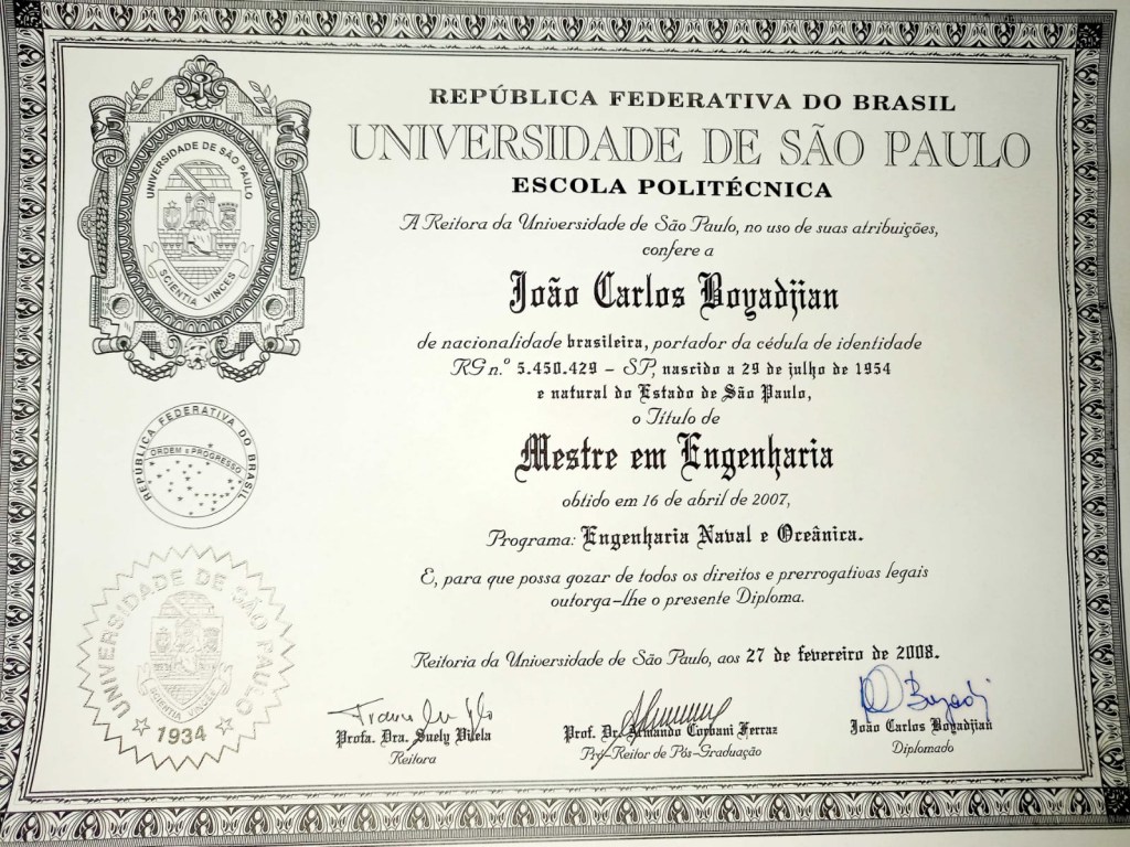 Certificado de Mestrado em Engenharia Naval – USP-SP