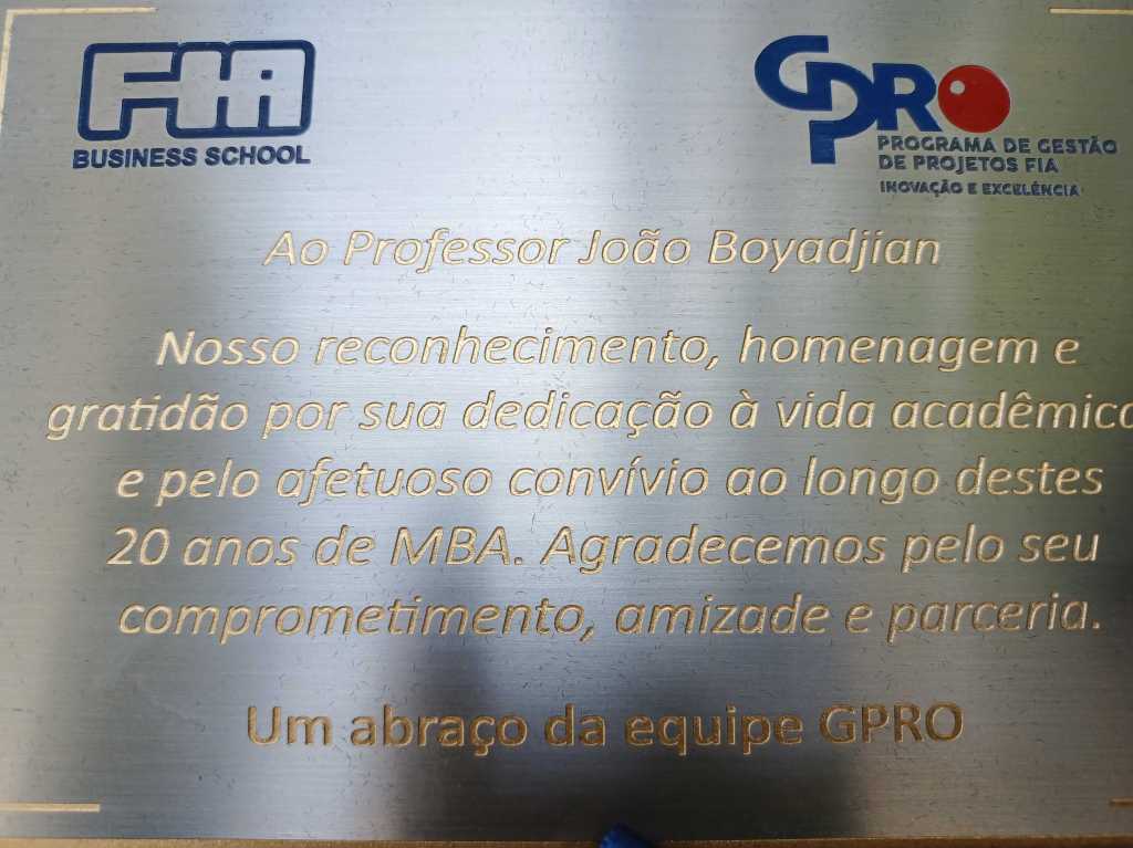 Homenagem de 20 anos de Professor dos cursos de MBA e Pós graduação da FIA